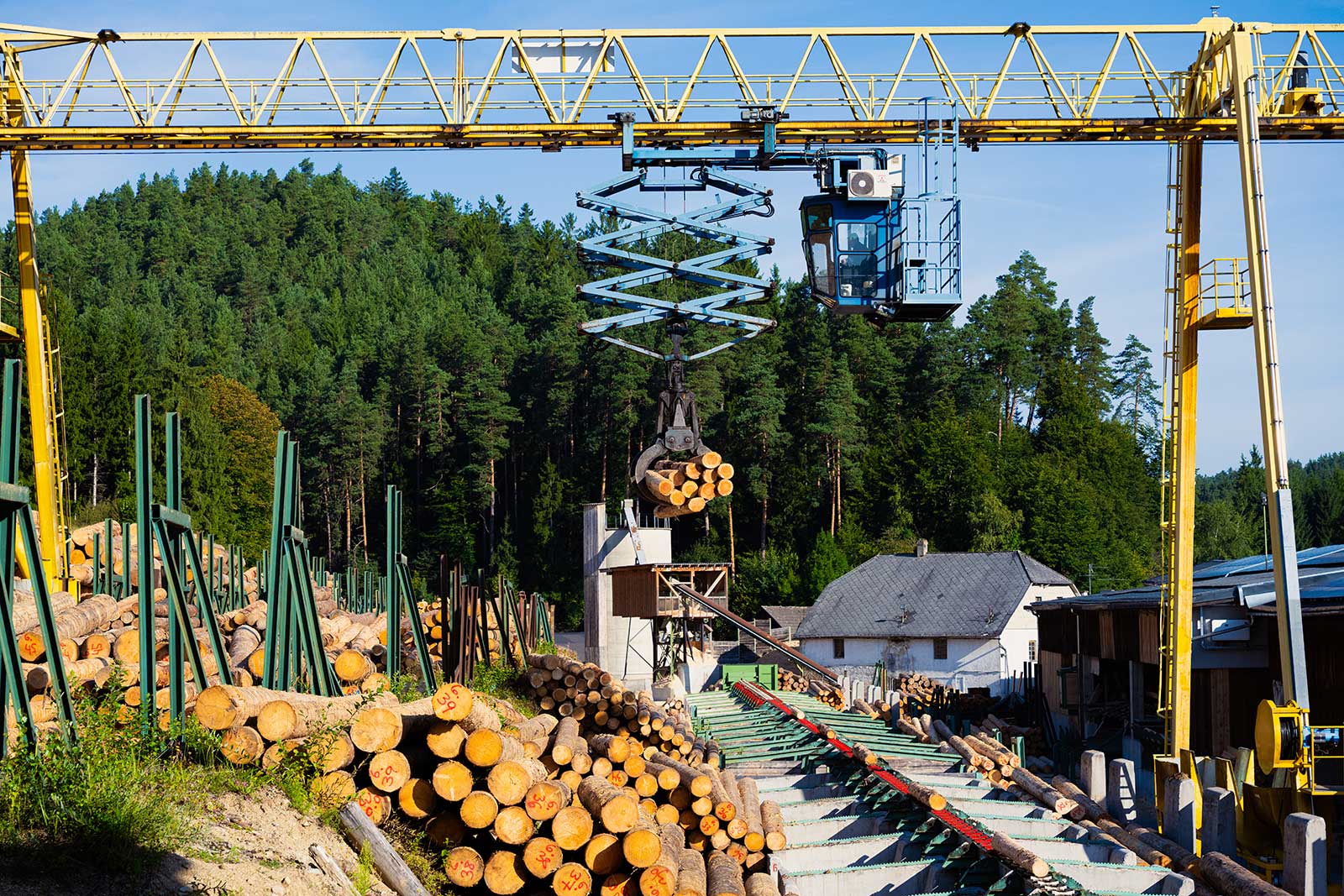 In unserem Sägewerk in Groß Gerungs verarbeiten wir jährlich rund 35.000 fm Kiefern- und Fichtenholz aus nachhaltig bewirtschafteten Wäldern der Region. Kurze Transportwege sind uns dabei besonders wichtig: Unser Einzugsgebiet liegt im Umkreis von etwa 80 Kilometern. Der Großteil des Rundholzes ist PEFC-zertifiziert und garantiert damit eine verantwortungsvolle Herkunft.